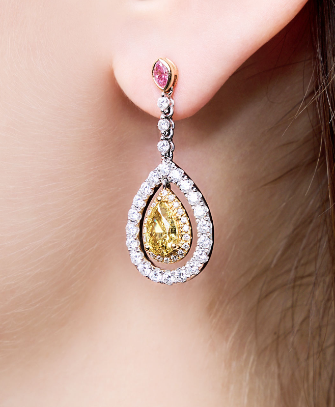 Featuring a pair of glittering pear-shaped yellow diamonds, symbolic of optimism, hope and happiness, dangling delicately below gorgeous pink marquise diamonds. Handcrafted in 18K white gold and accented by dazzling diamonds totalling over 6 carats, the one-of-a-kind combination of gold and blush hues gives these earrings a warm, sunset-inspired glow, delicate yet eye-catching.