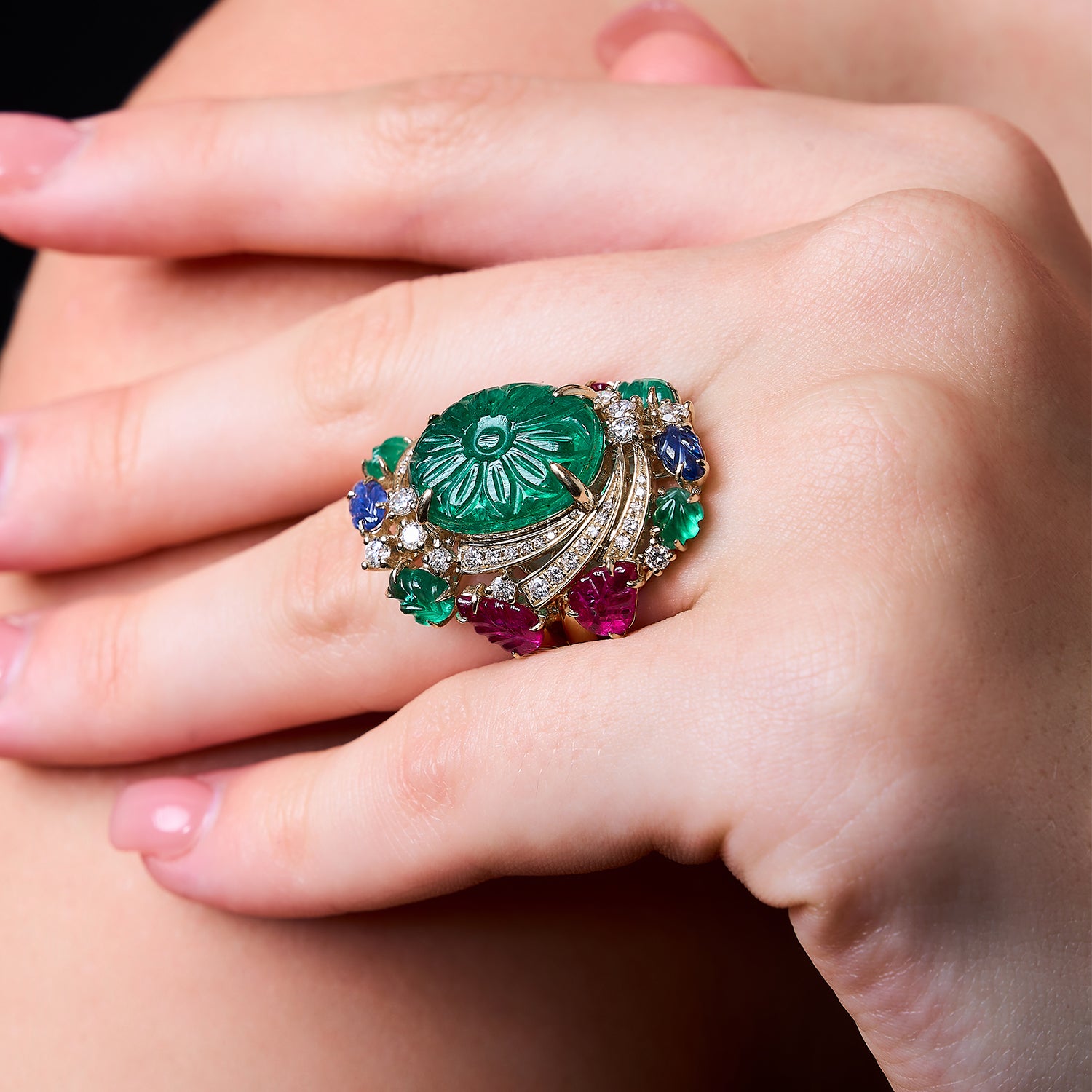 The collection draws inspiration from the beauty of nature. Through the rich volume of our carved rubies, sapphires and emeralds reflects the colourful and whimsical nature of the style. The gemstones are often set in a variety of